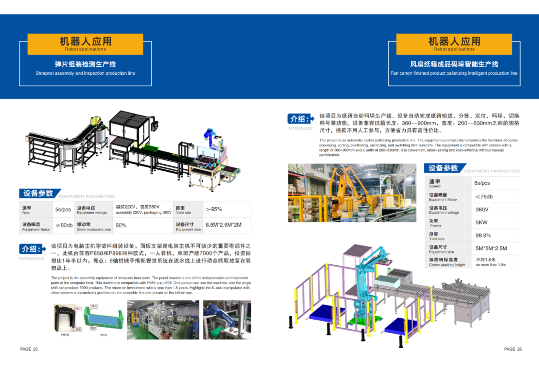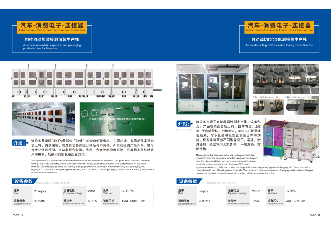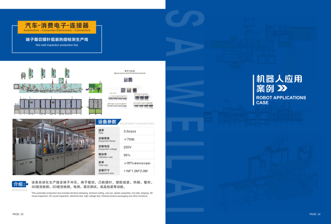 其自主研发制造与销售的非标定制生产线,广泛应用在通讯、消费电子、汽车电子等行业的各类连接器生产制造环节,可实现高速插针、折弯、铆压、激光焊接、打标、高精度点胶、外观及尺寸检测、成品包装等生产工艺。其自主研发制造与销售的标准设备及生产线,在通讯、家居五金、家电、灯饰量器、生物医药等行业,可实现产品的快速装配、高精度视觉检测、多种方式包装等制造环节的智能化、自动化生产。在工业机器人应运方面,积累了成熟的经验和诸多成功案例,涉及汽车配件相关、智能仓储物流、冲床与注塑机上下料、堆垛、焊接、打磨抛光等领域。