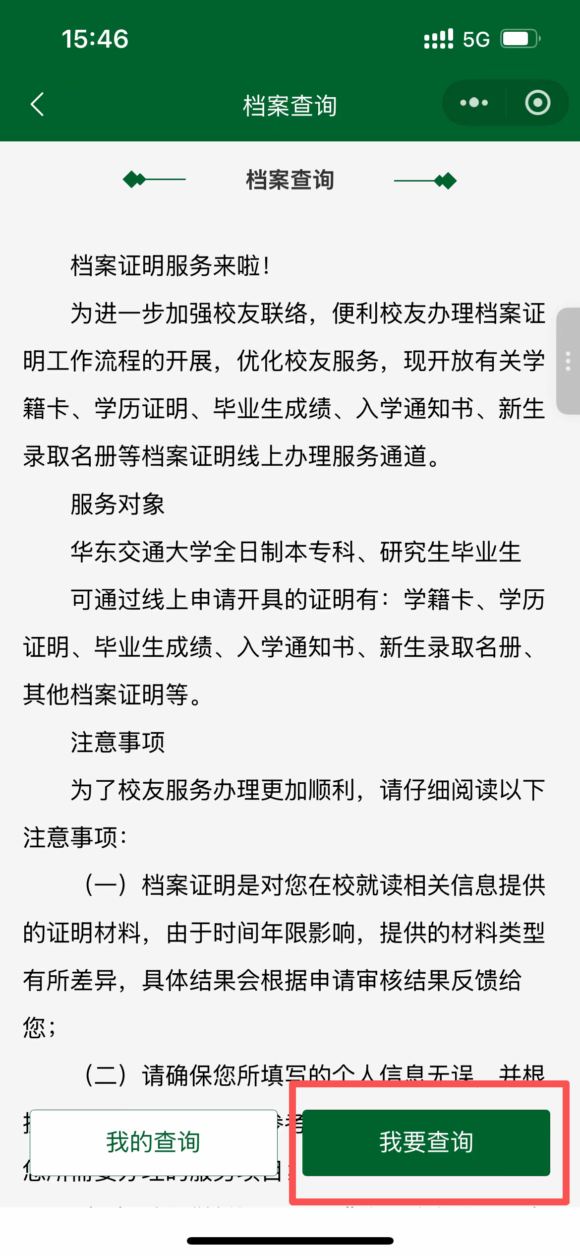 三、阅读说明后,点击“我要查询”填写表单信息,填写完整后提交,等待管理员审核;