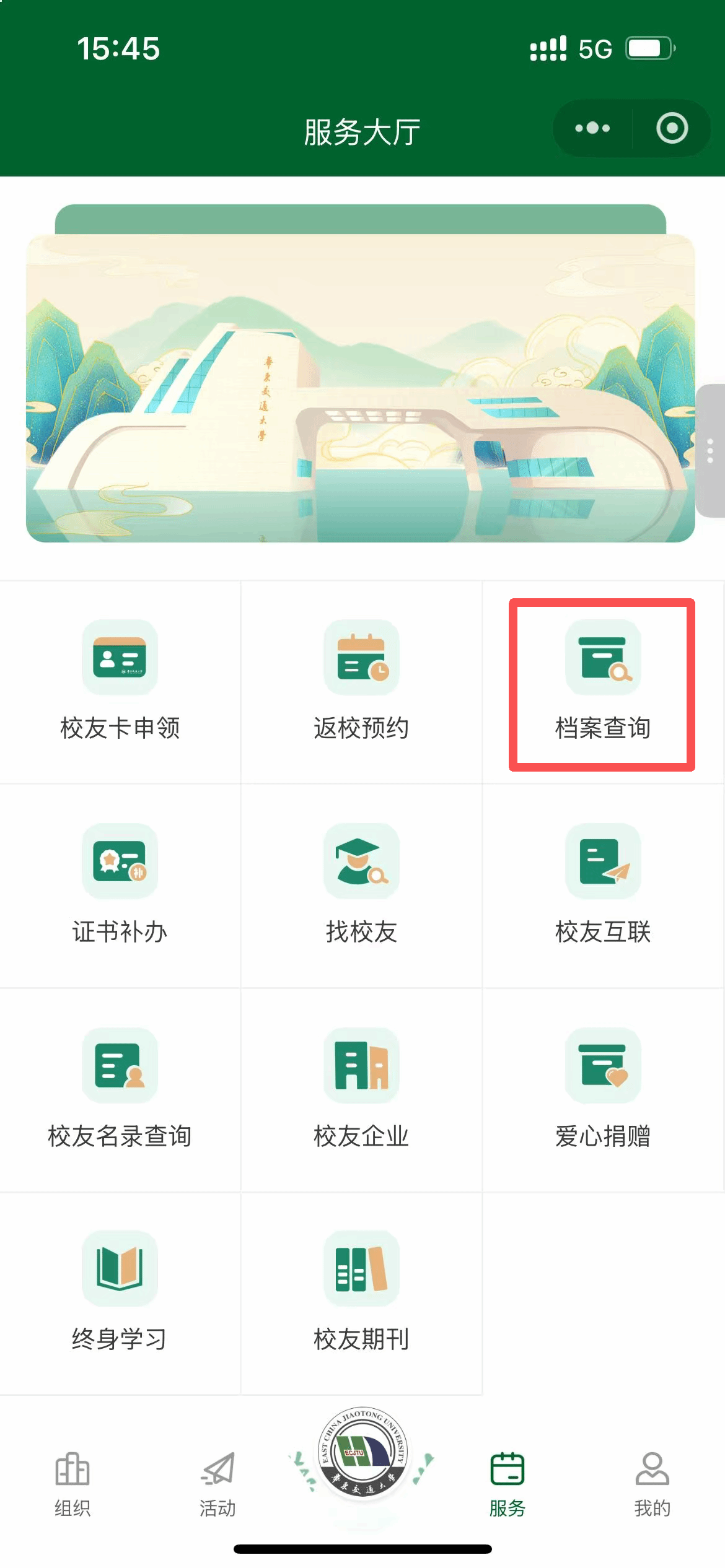 二、点击小程序服务大厅的服务按钮“档案查询”;