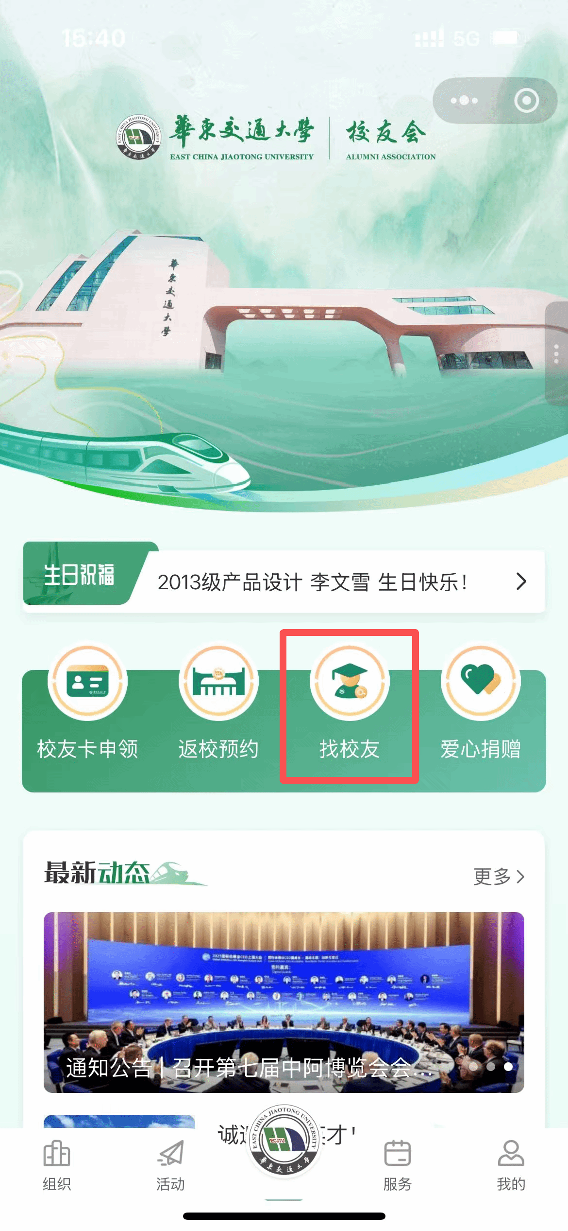 二、点击小程序首页的快捷菜单“找校友”;